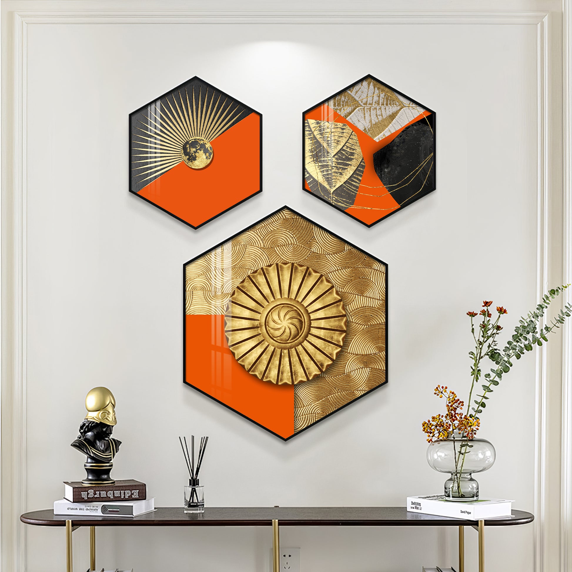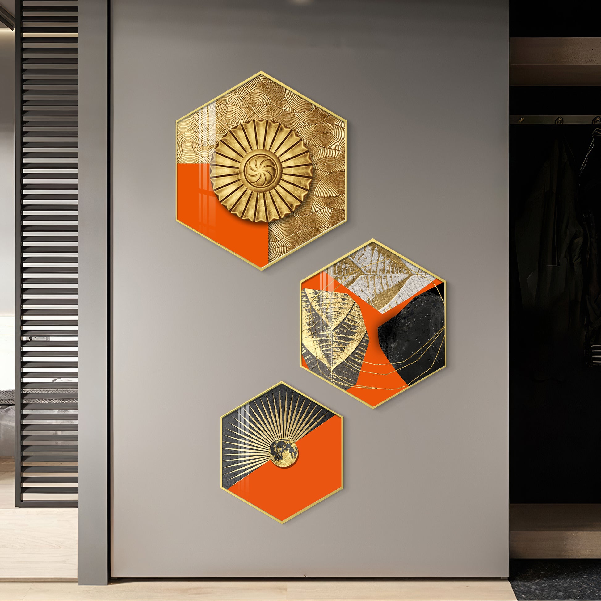Gold & Orange Accents Premium Acrylic Hexagon Wall Art (Set of 3)