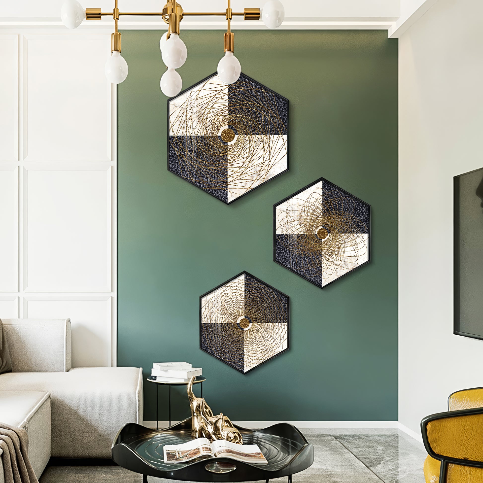 Spiral In Golden Premium Acrylic Hexagon Wall Art (Set of 3)