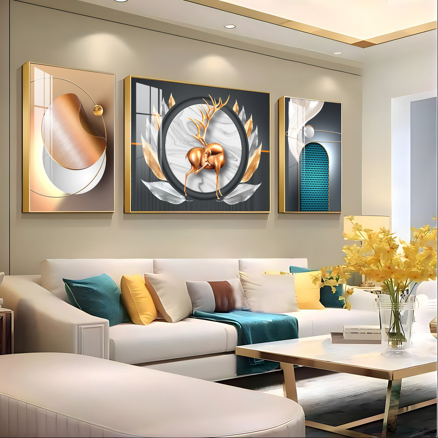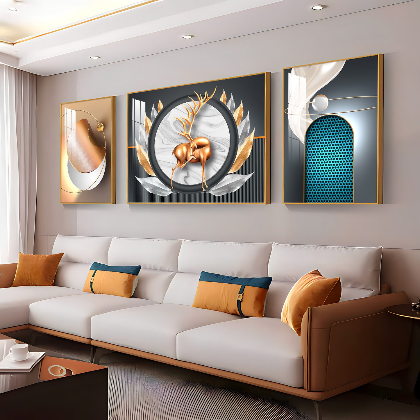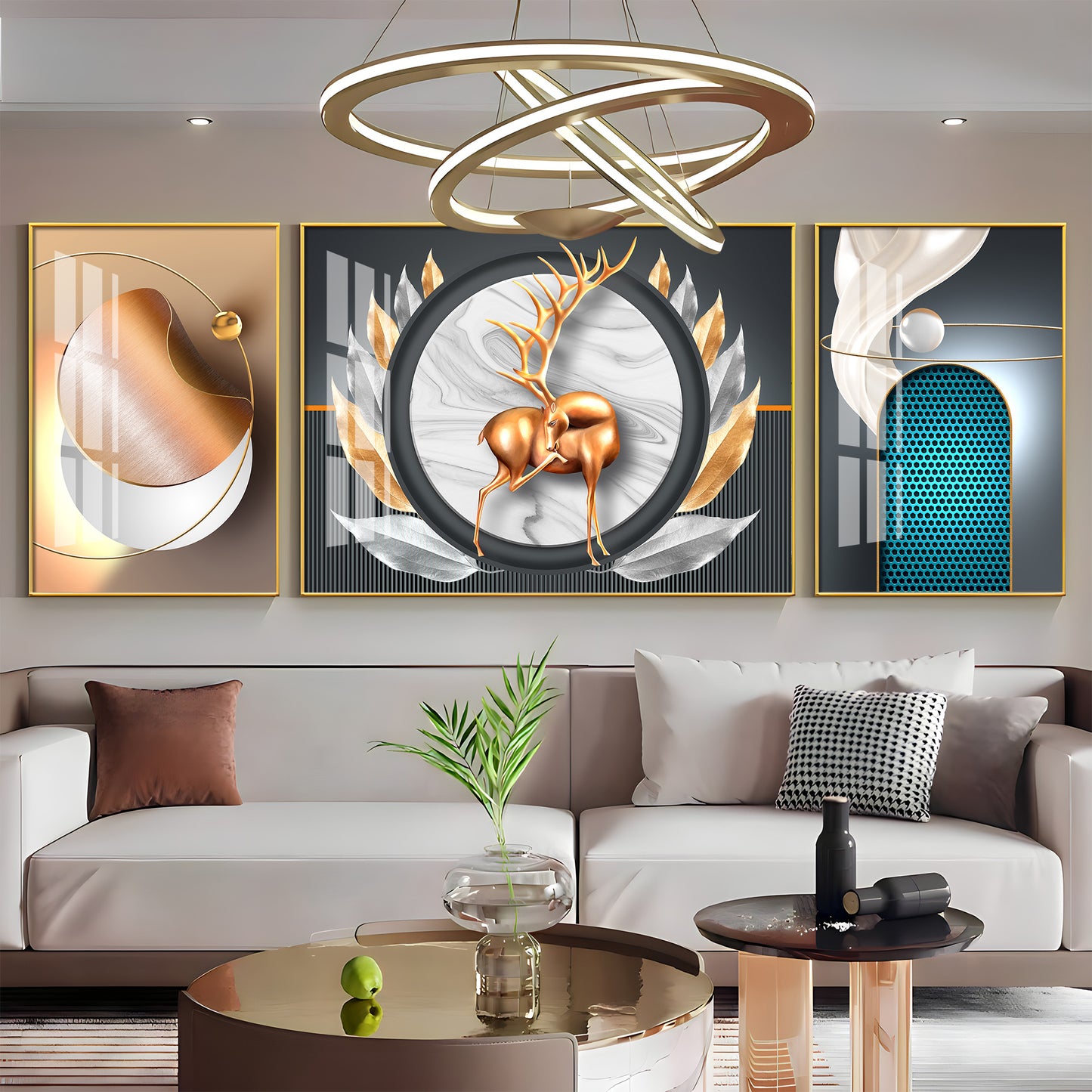 Deer and Feathers Premium Acrylic Wall Art (Set of 3)