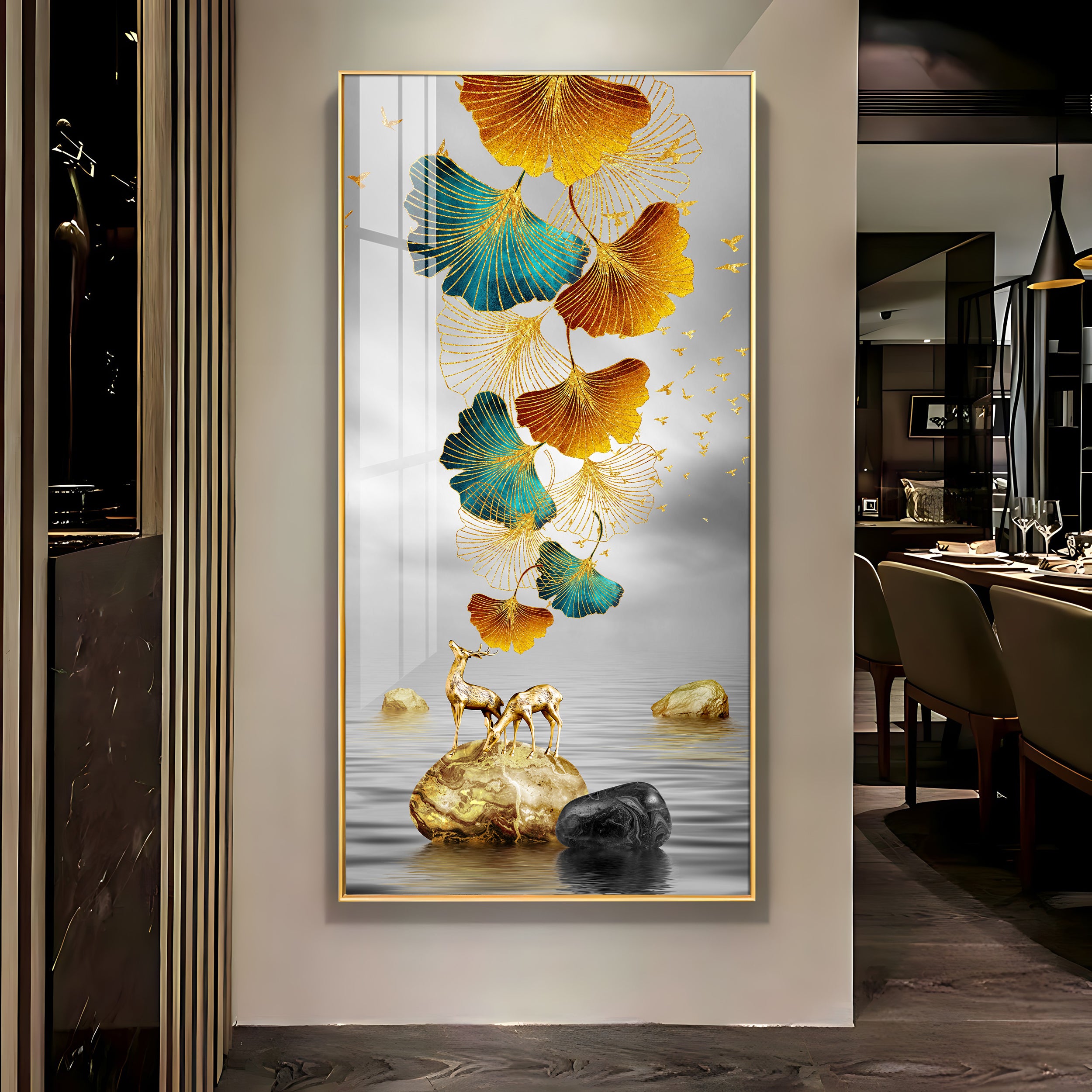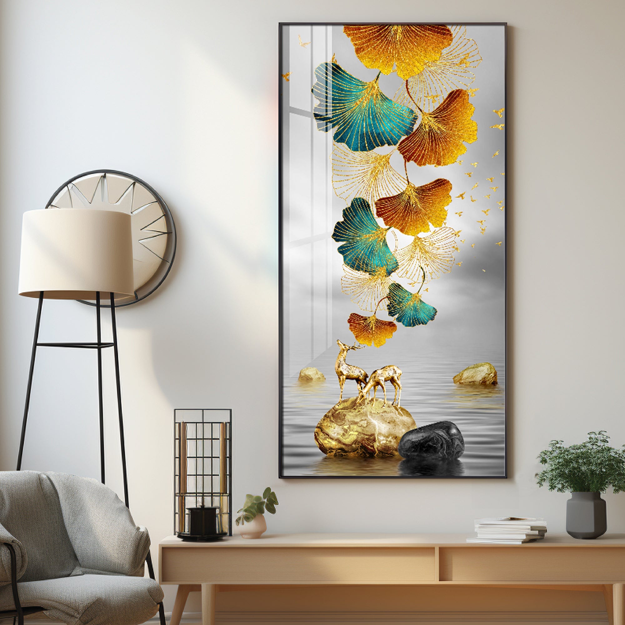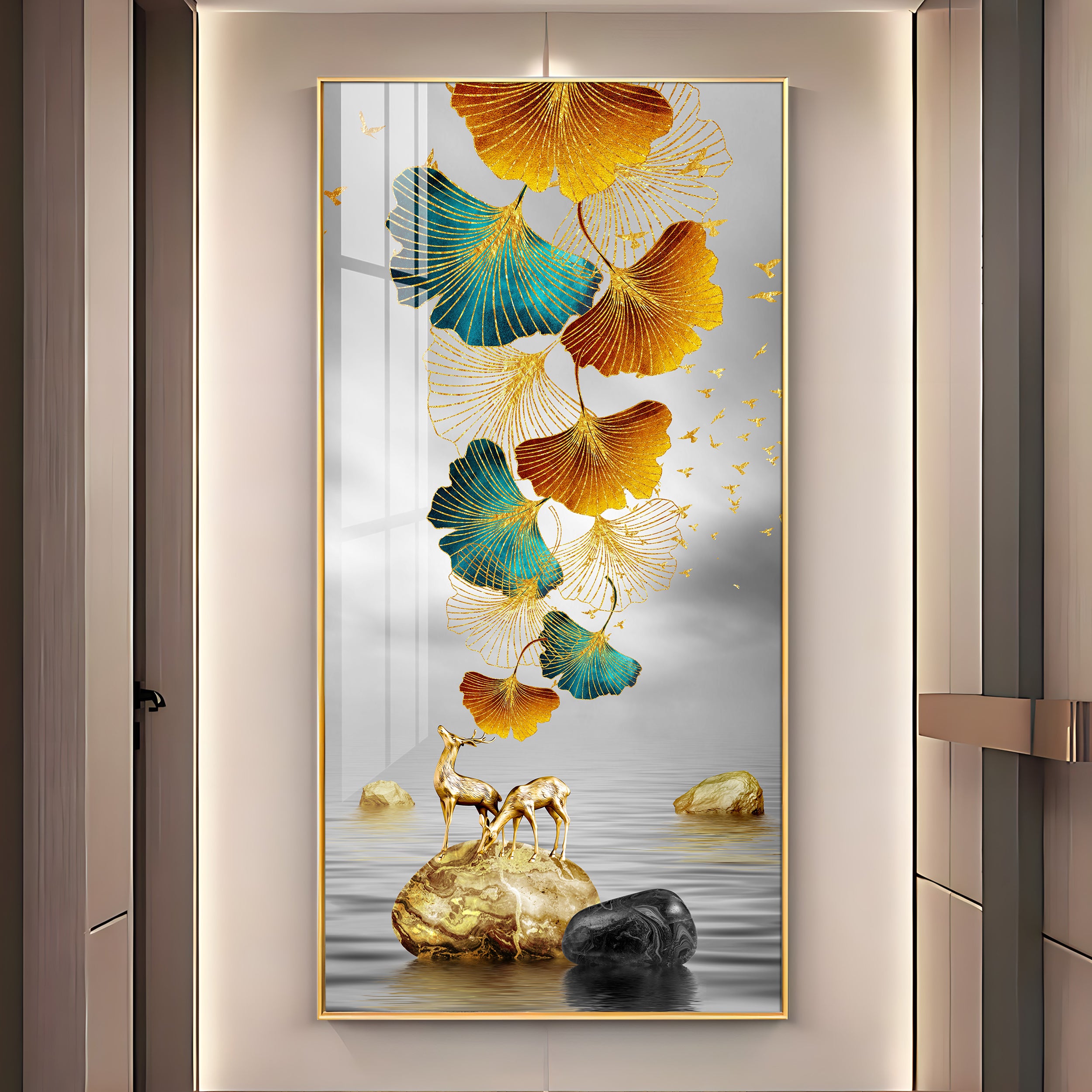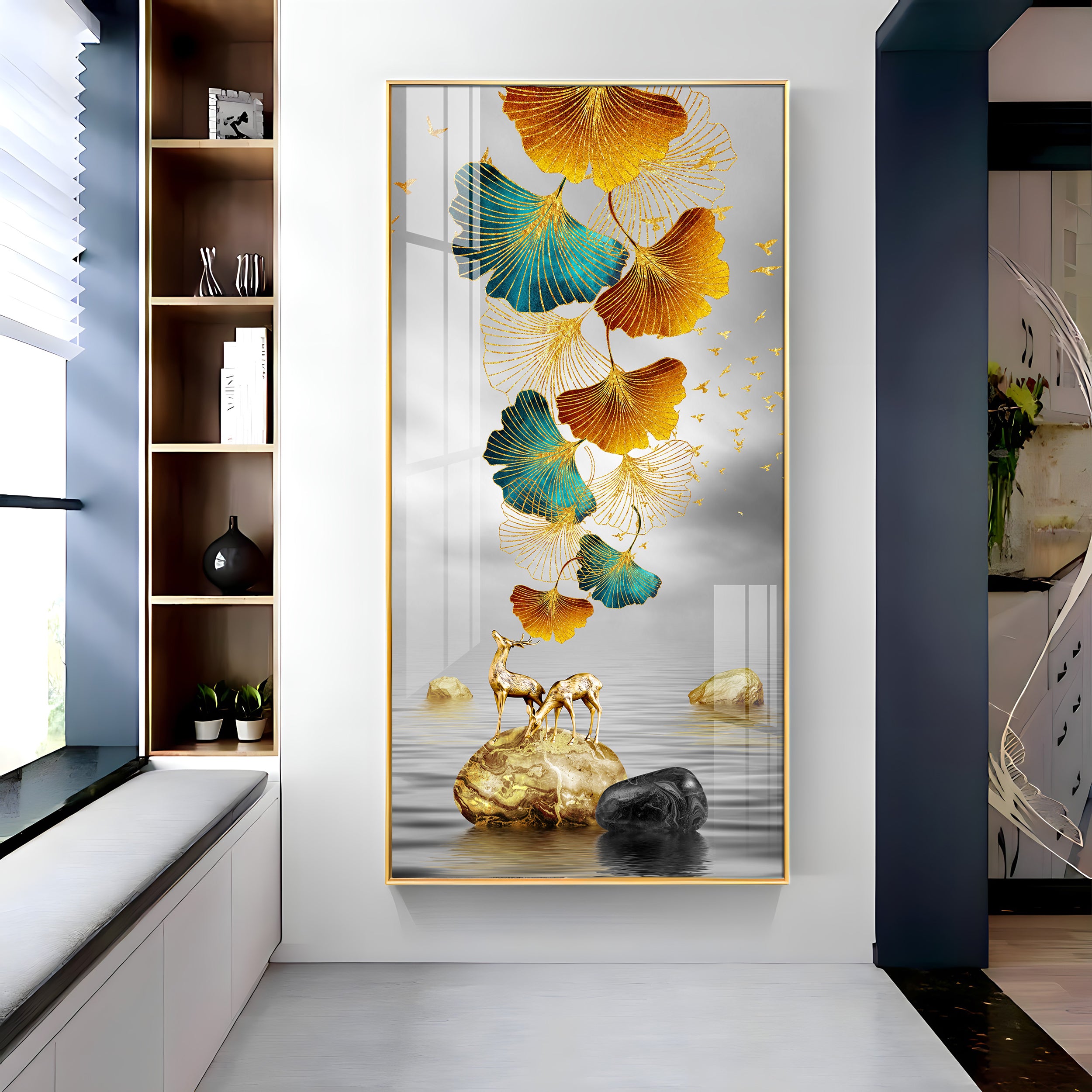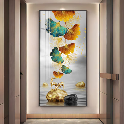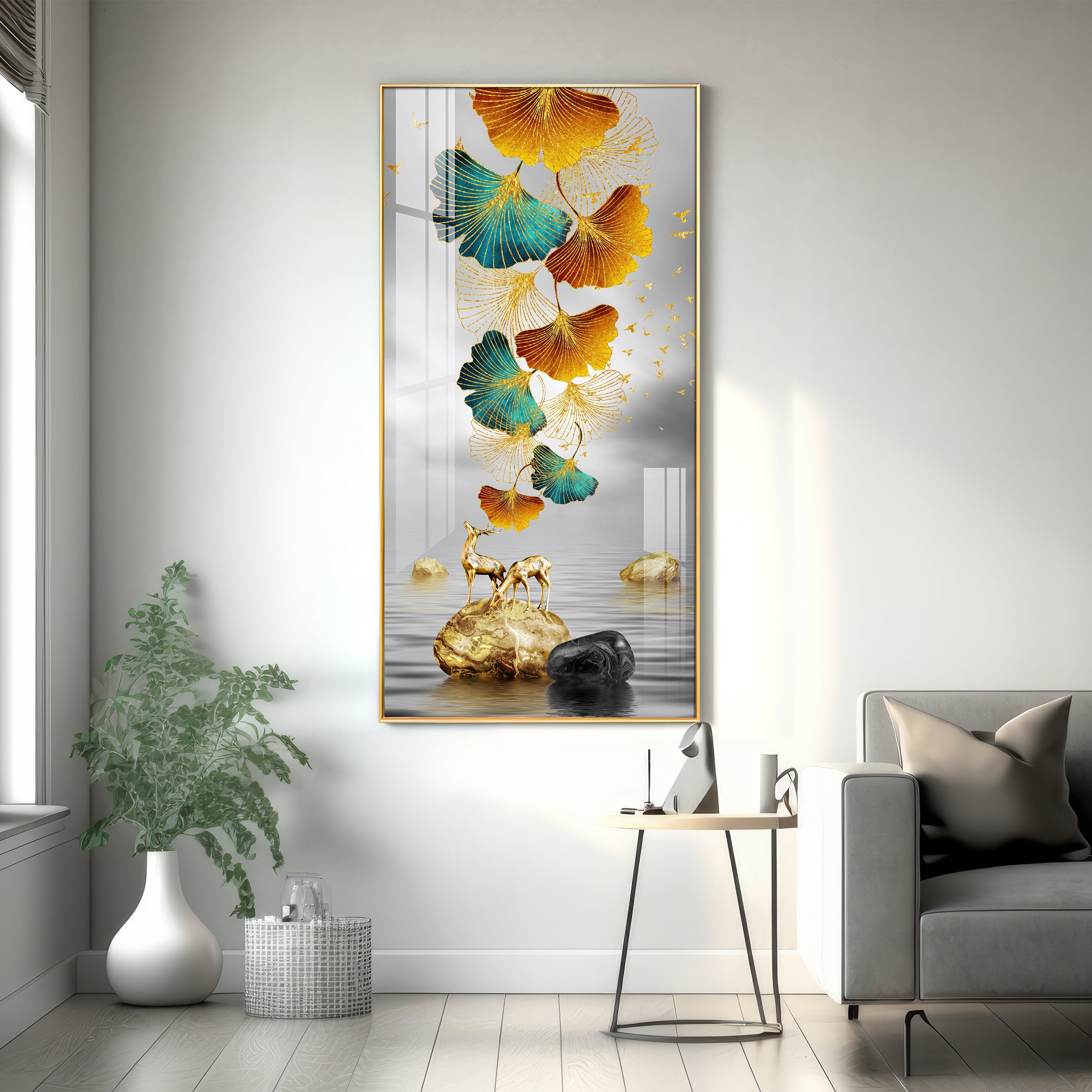 Golden Elk Leaves With Deer Premium Acrylic Vertical Wall Art