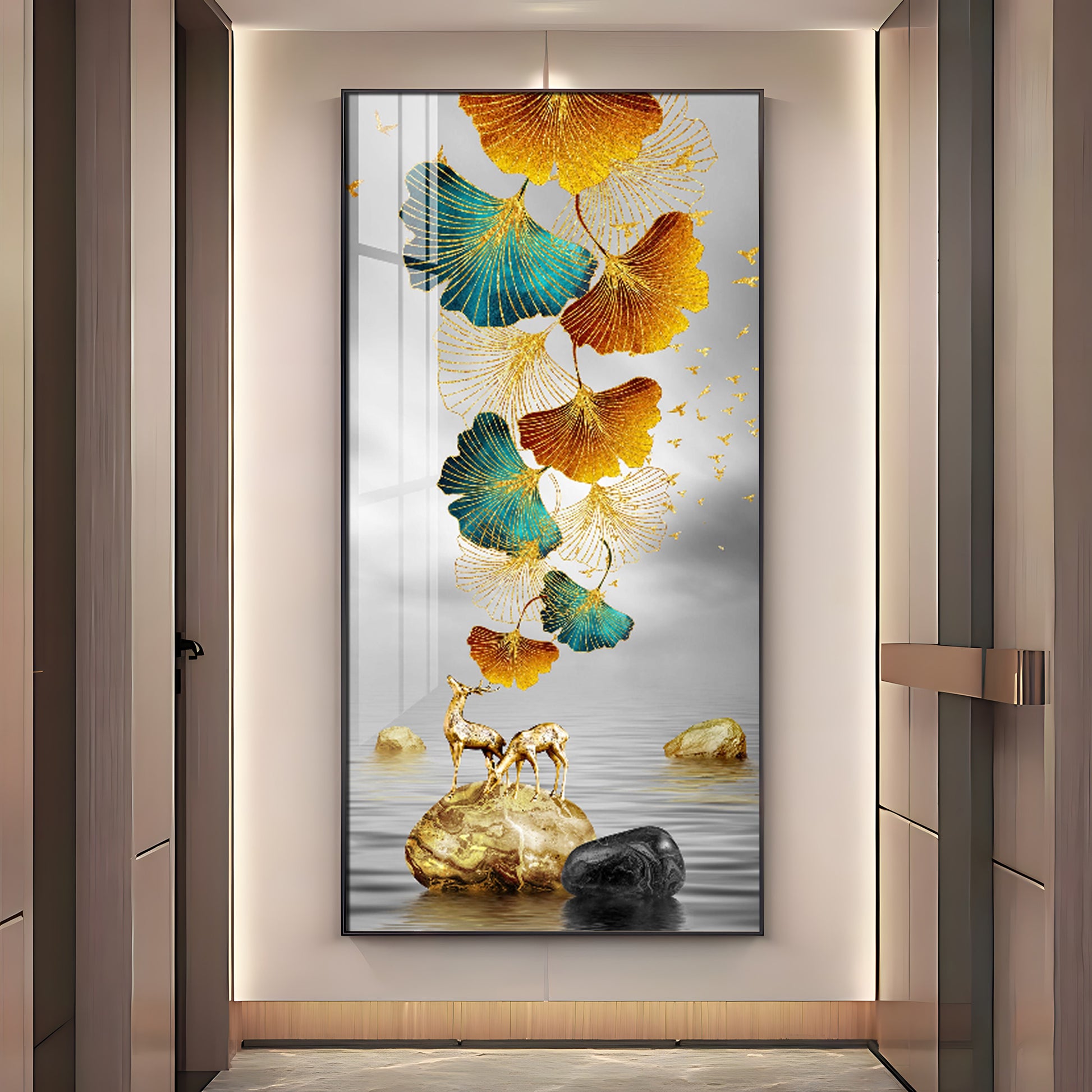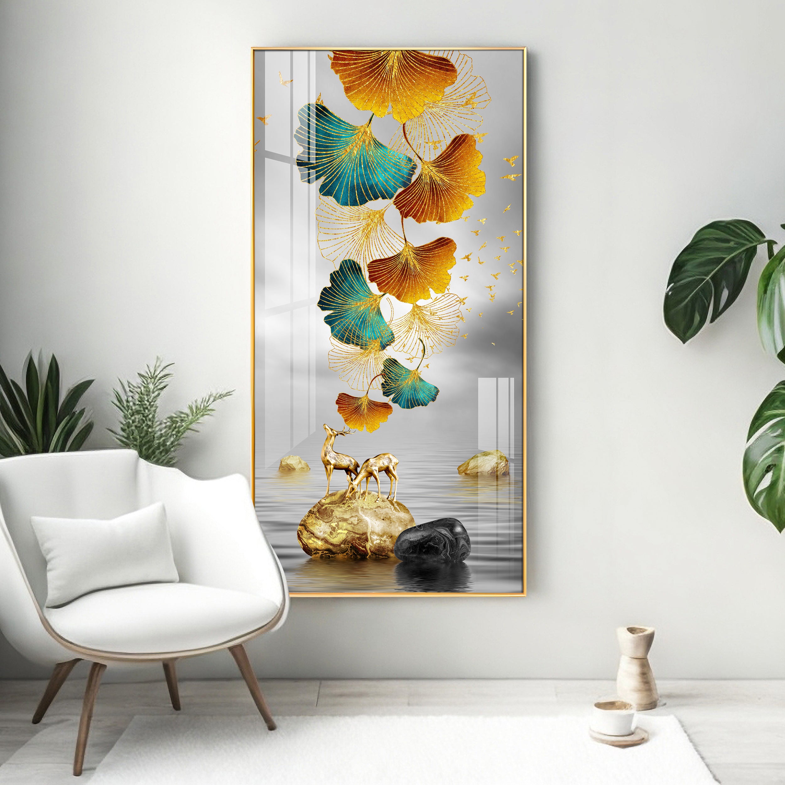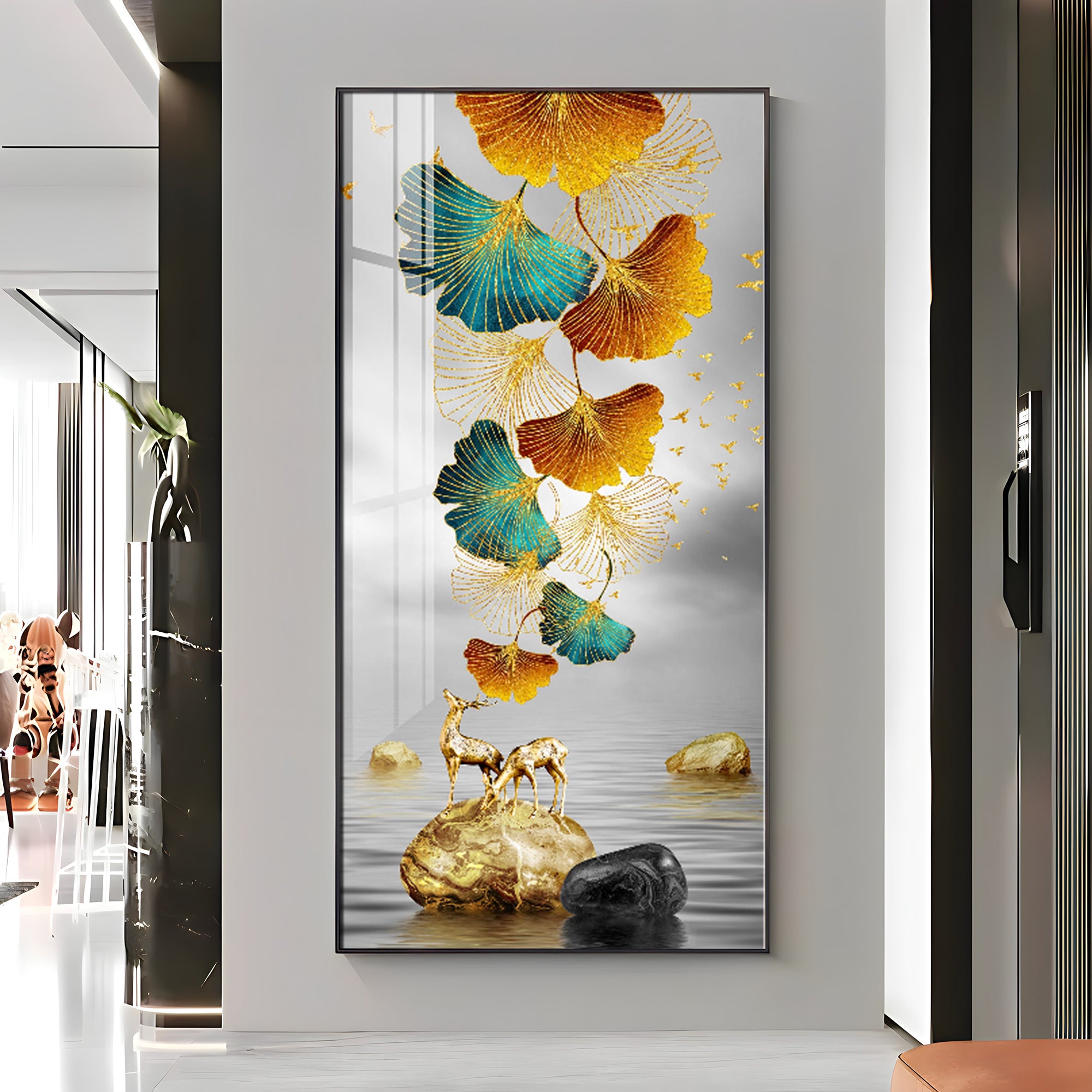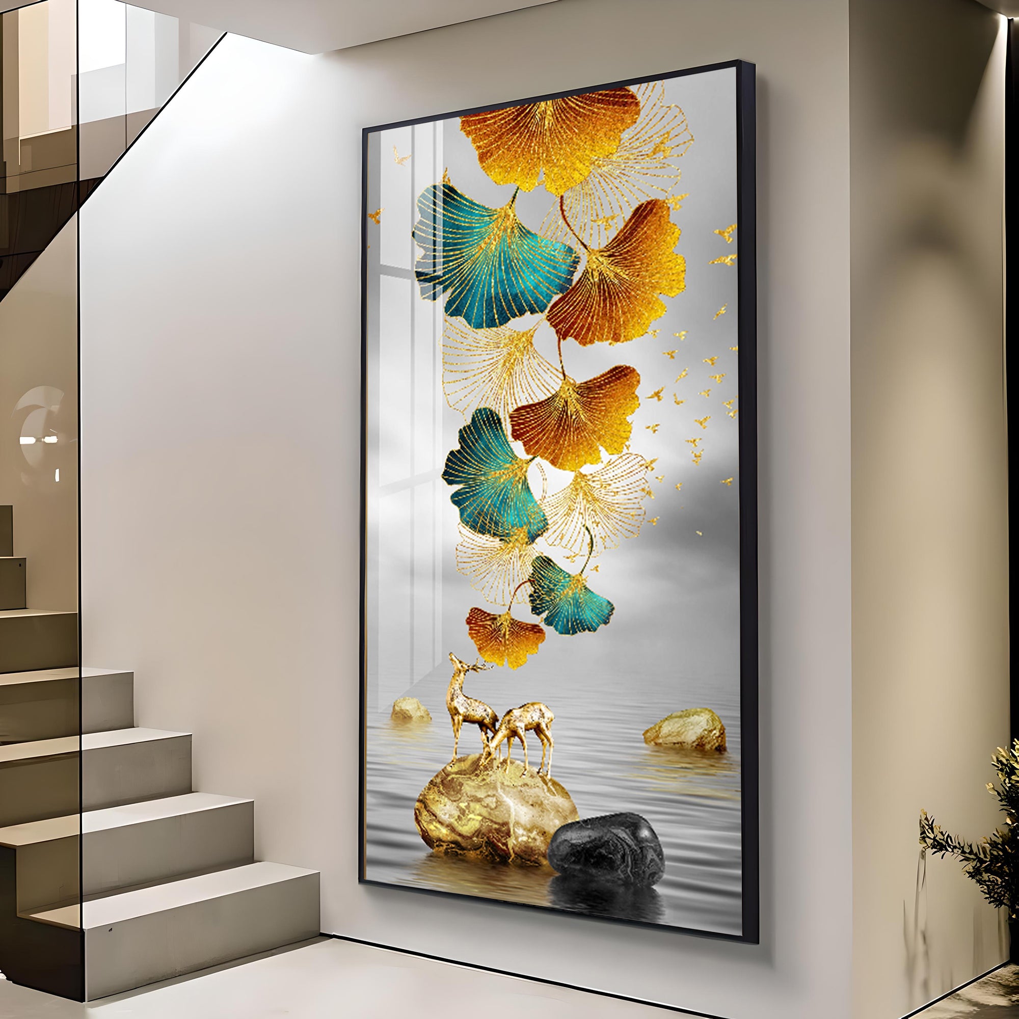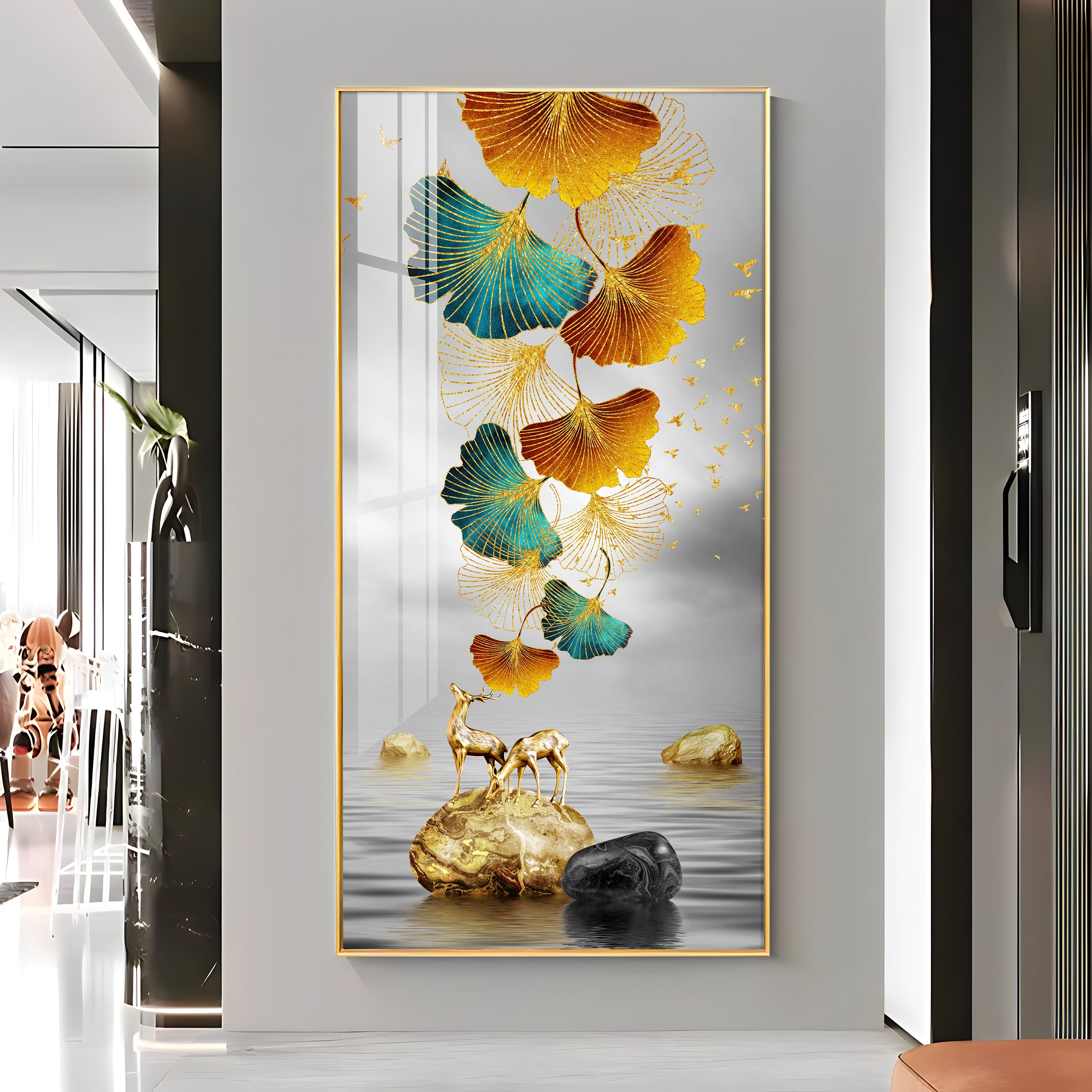 Golden Elk Leaves With Deer Premium Acrylic Vertical Wall Art