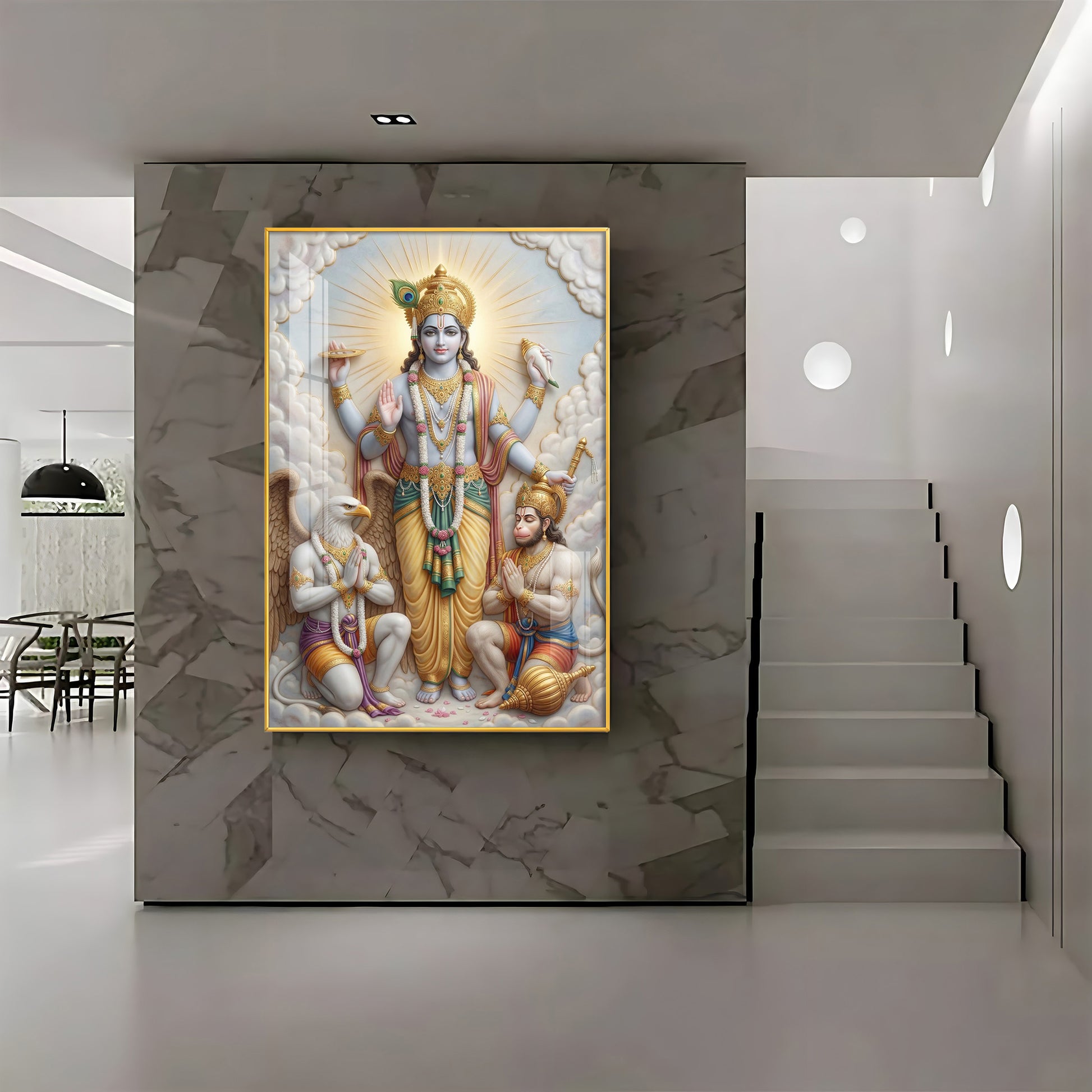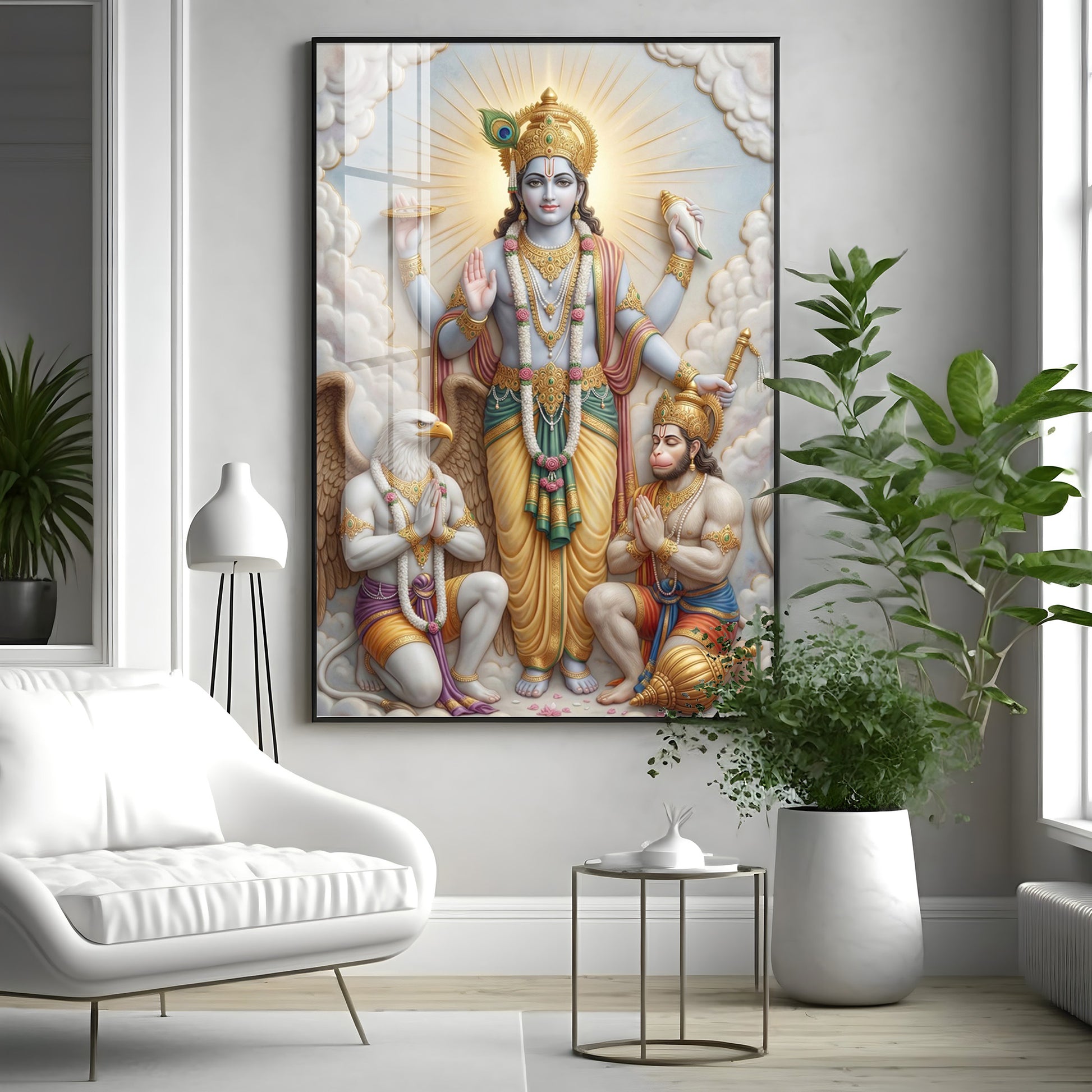 Lord Vishnu With Garuda And Hanuman Ji Premium Acrylic Vertical Wall Art