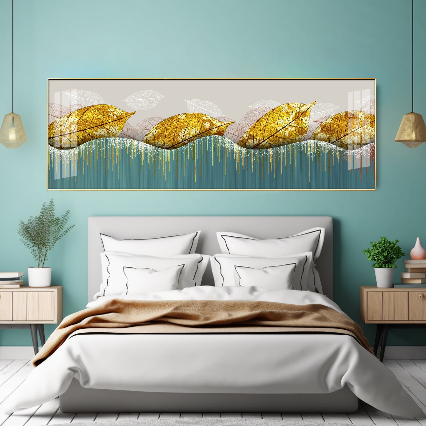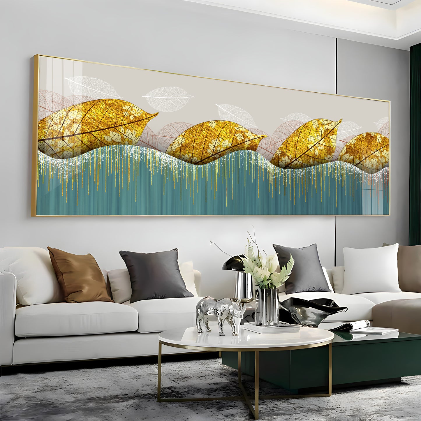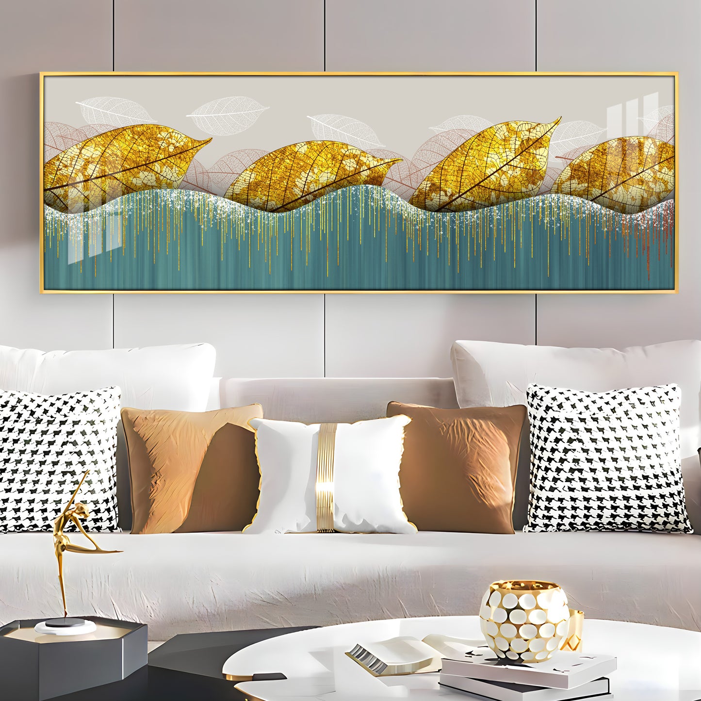 Lush Golden Leaves Luxury Crystal Horizontal Wall Art