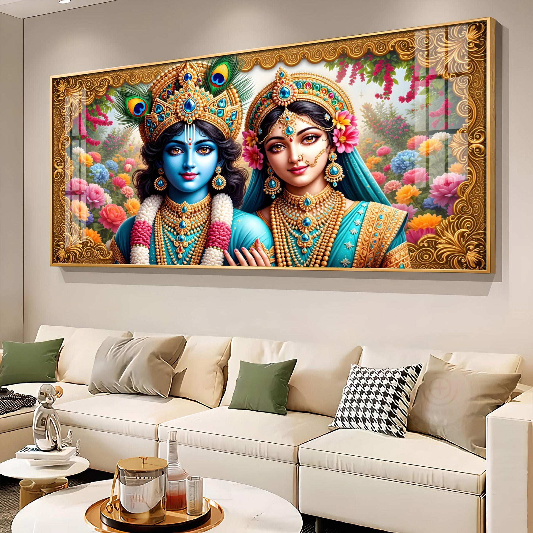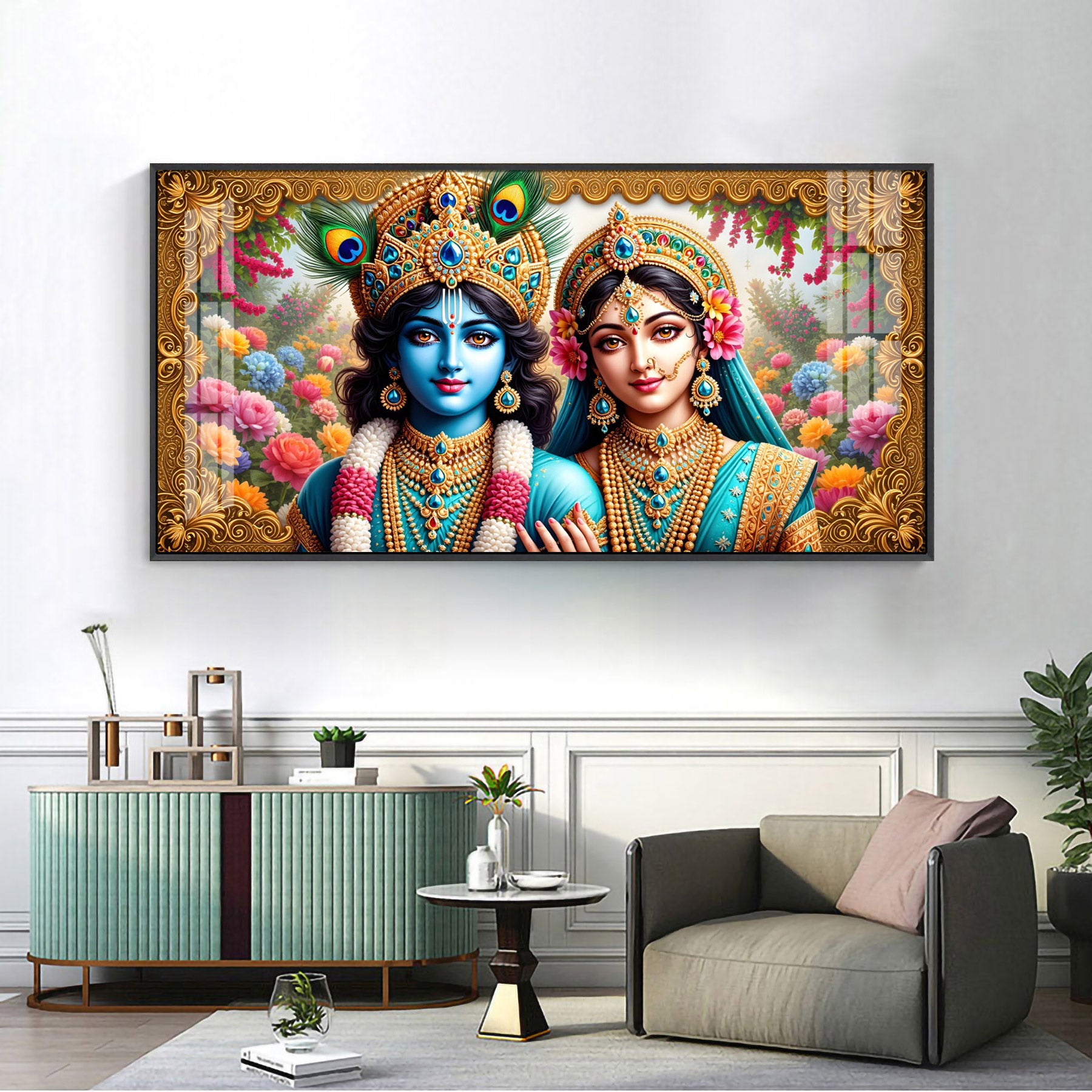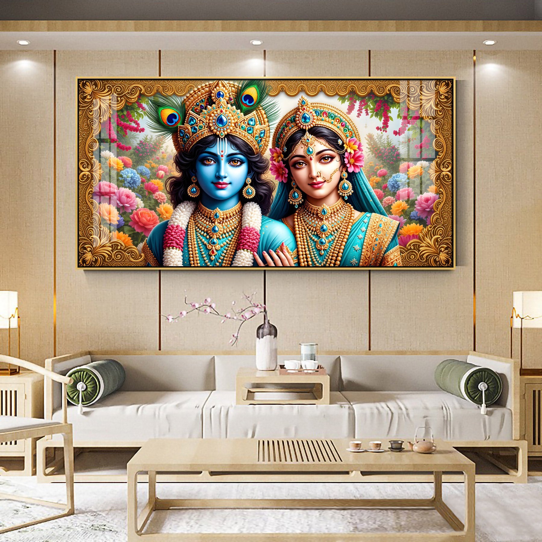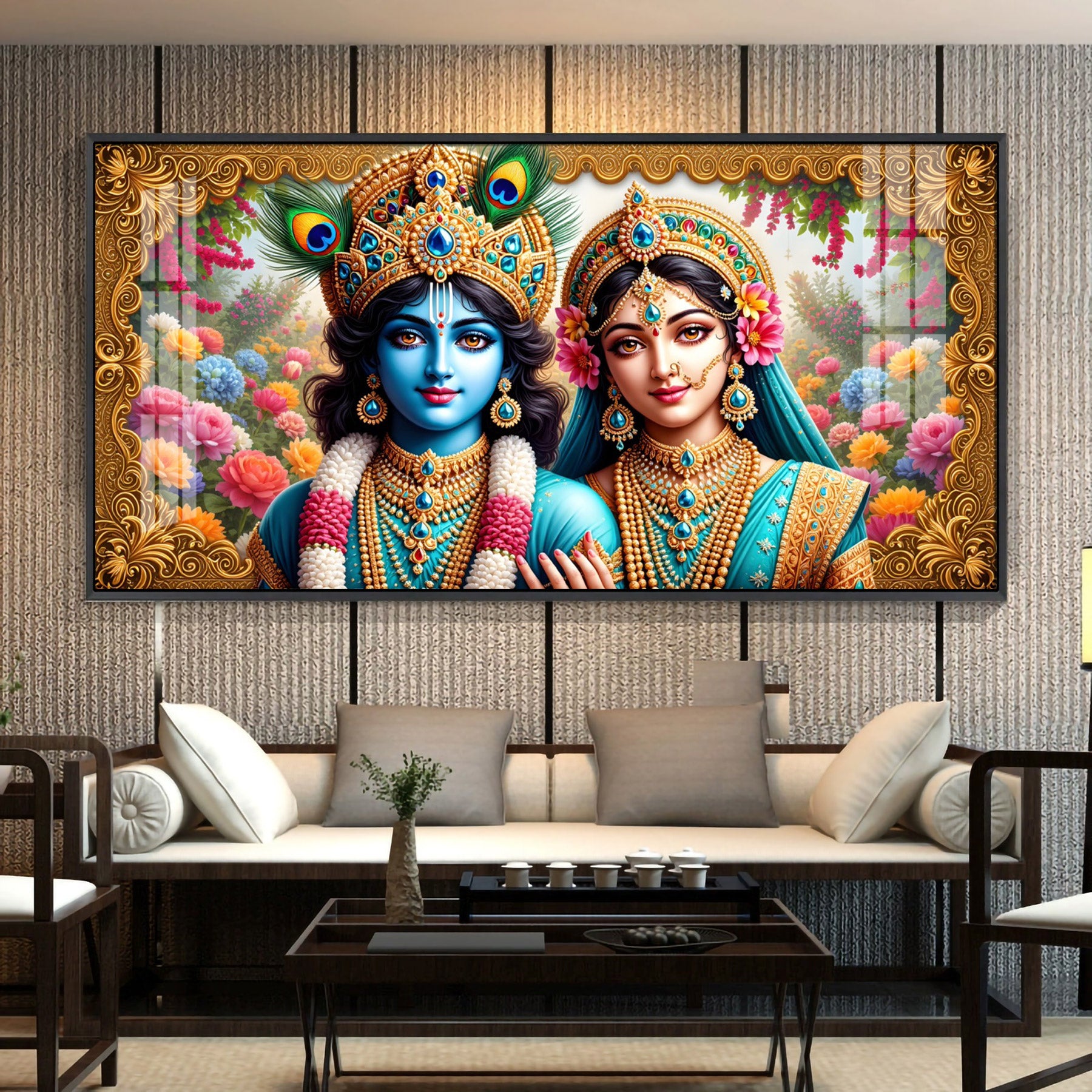 Radha Krishna In Floral Premium Acrylic Horizontal Wall Art