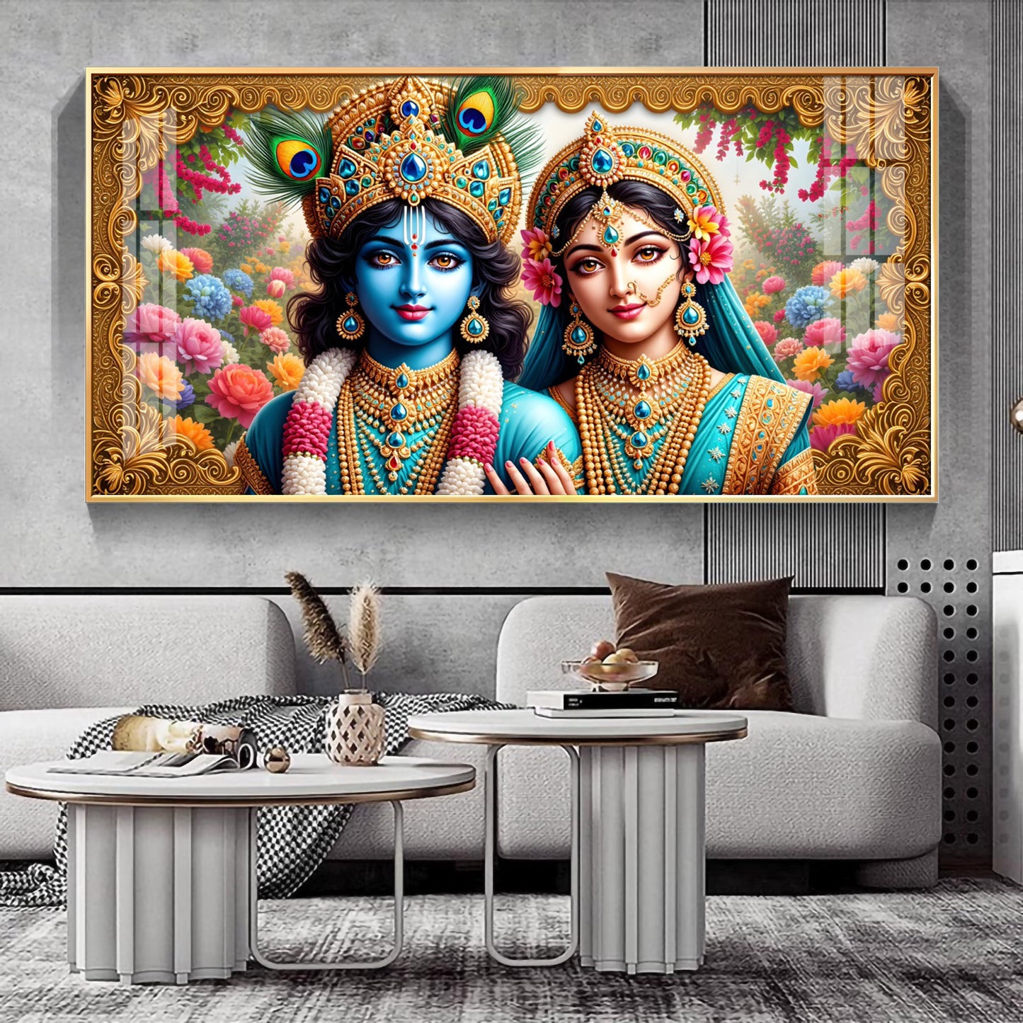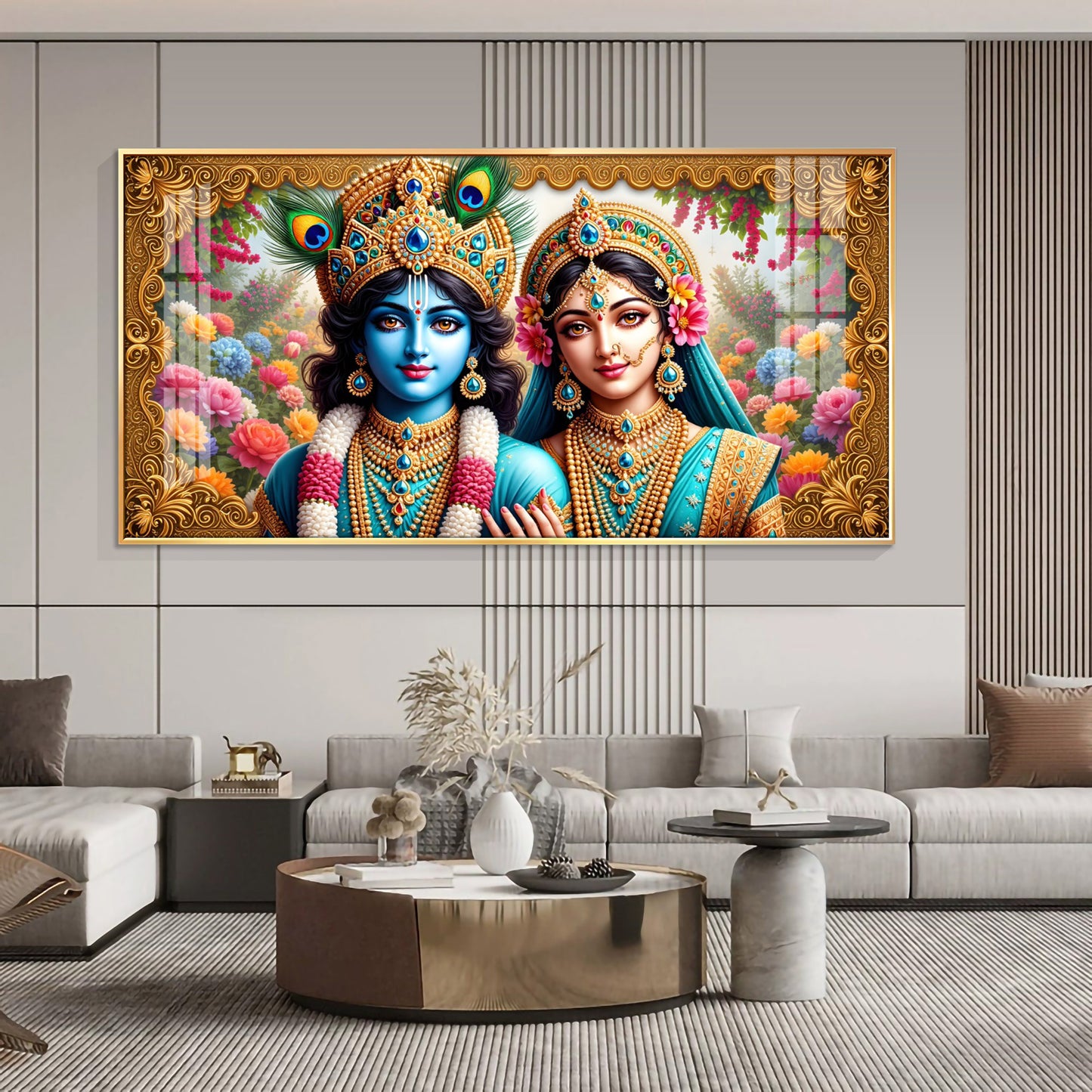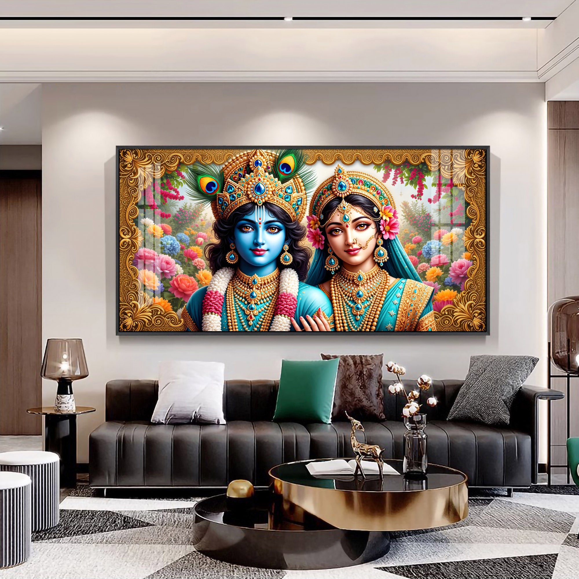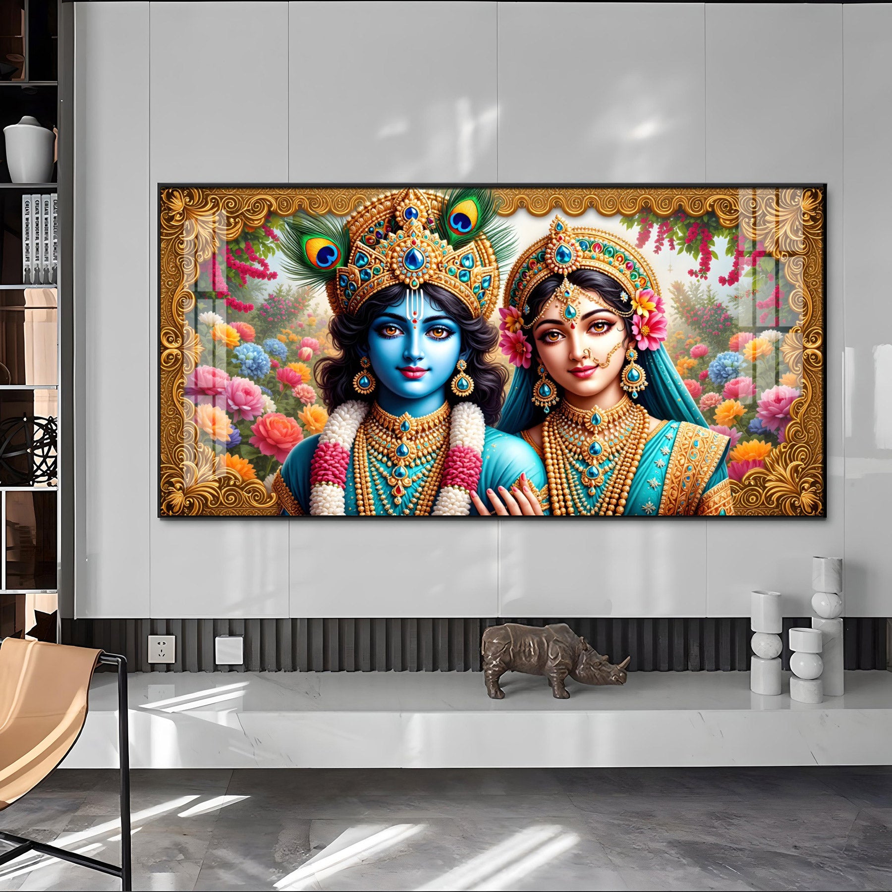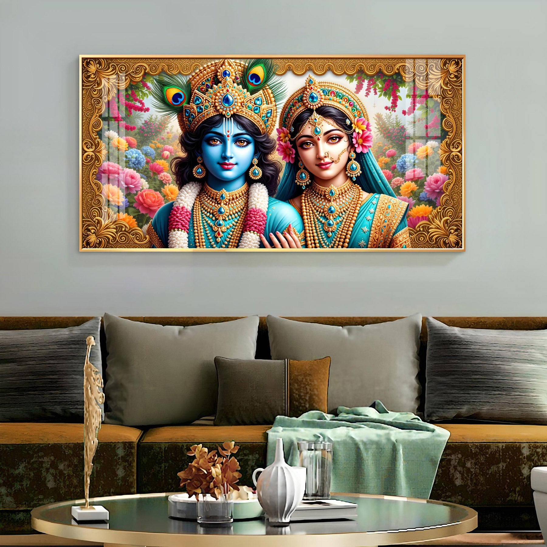 Radha Krishna In Floral Premium Acrylic Horizontal Wall Art