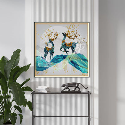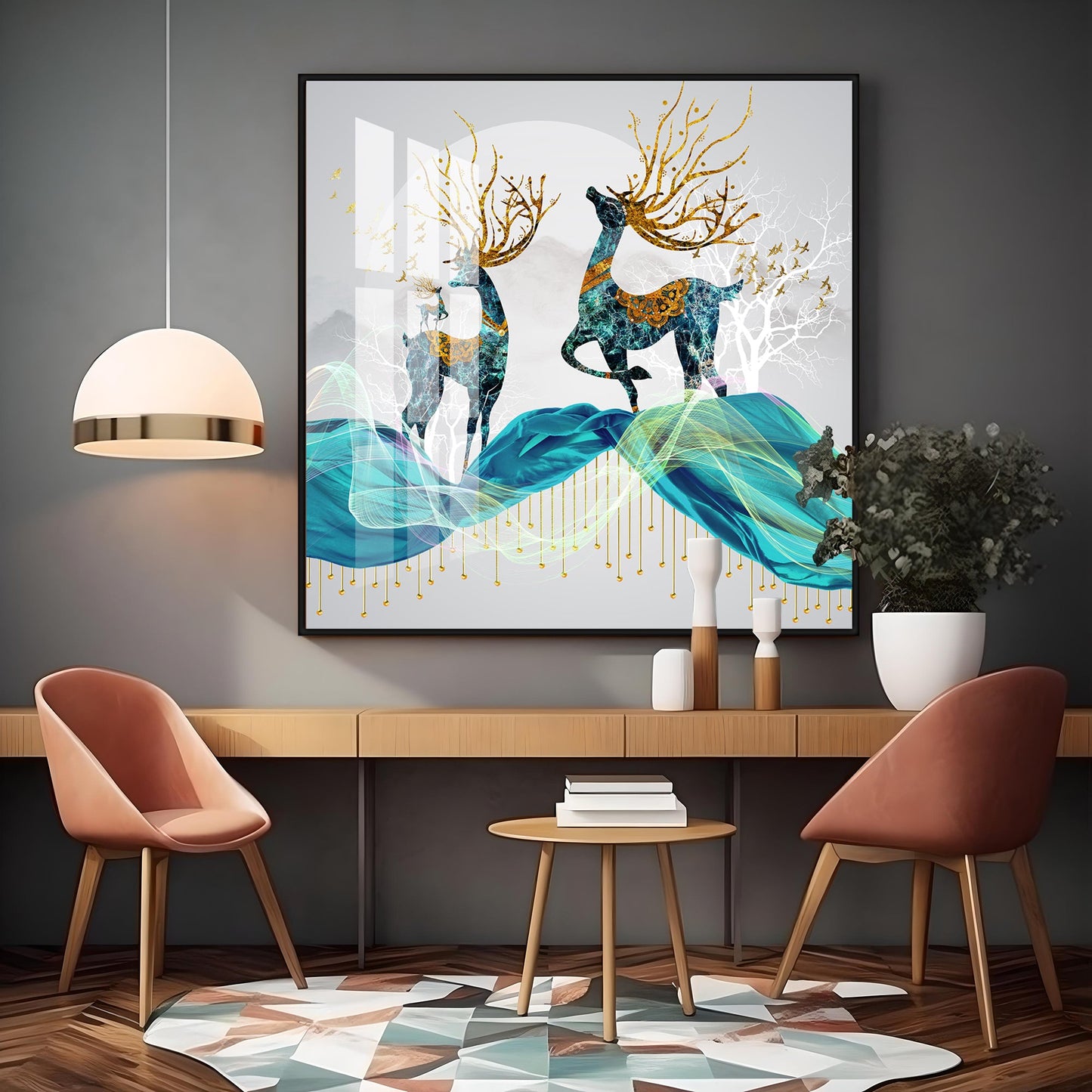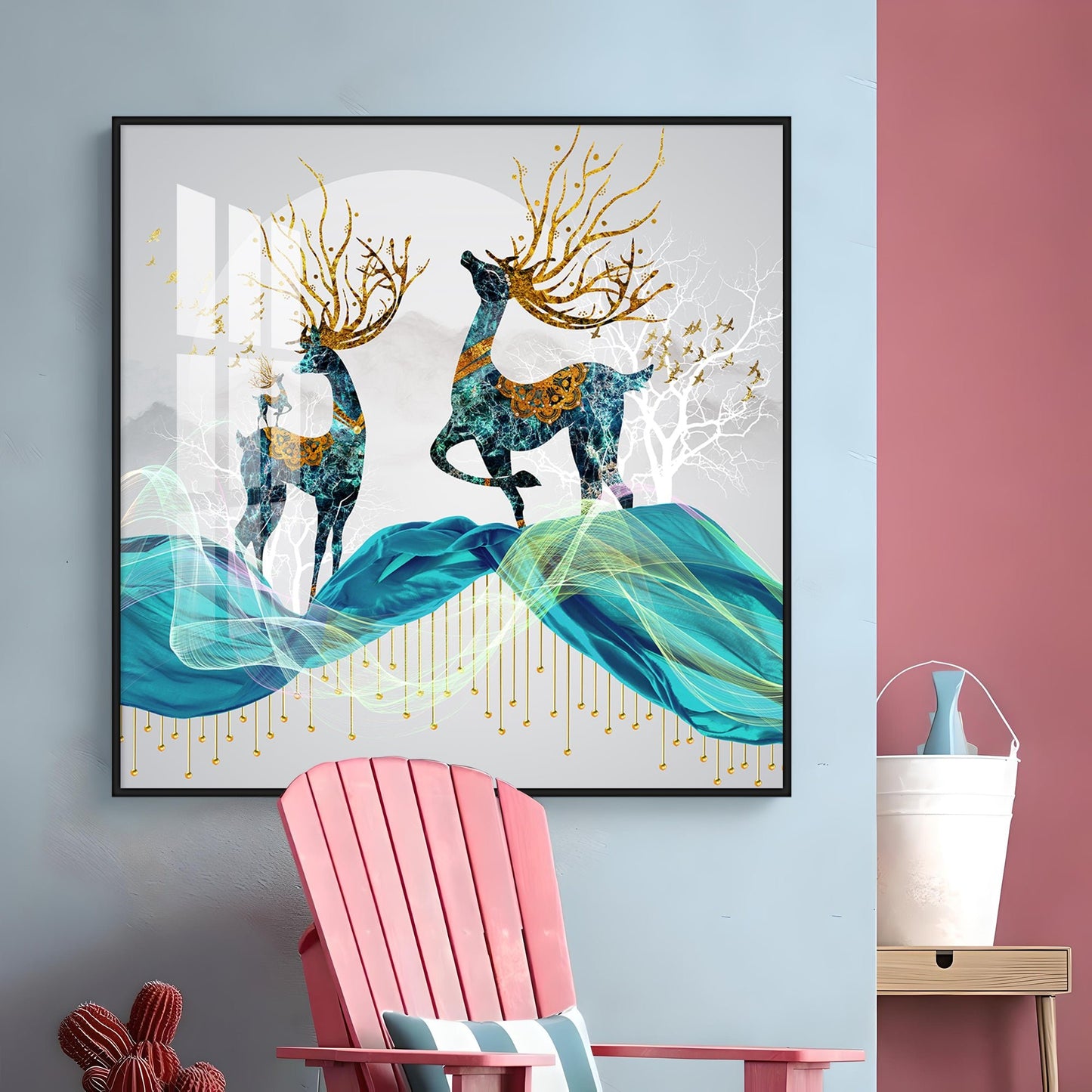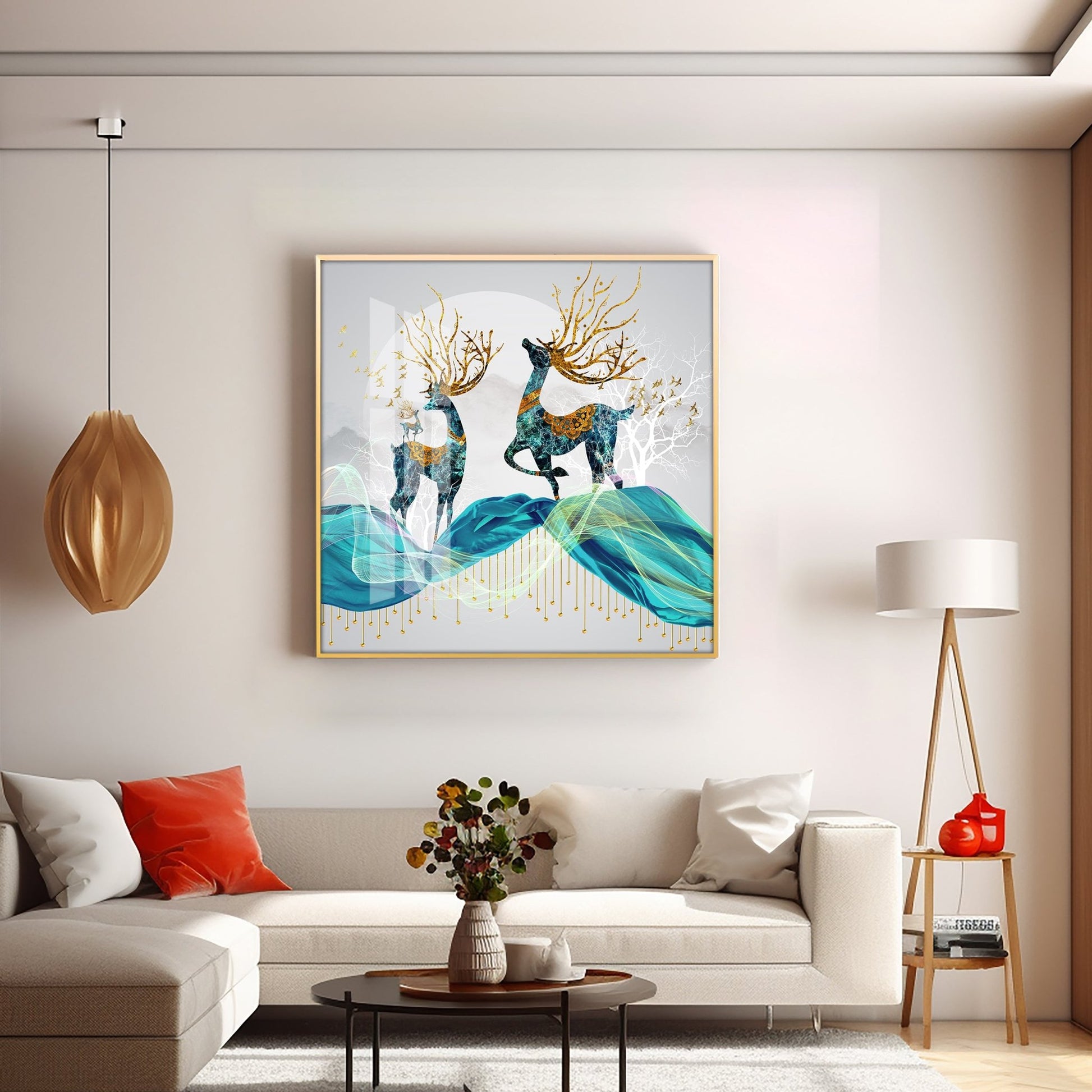 Two Beautiful Blue Deers Luxury Crystal Square Wall Art